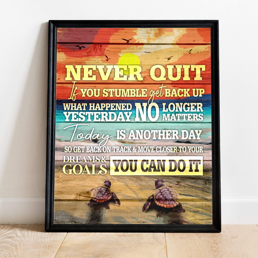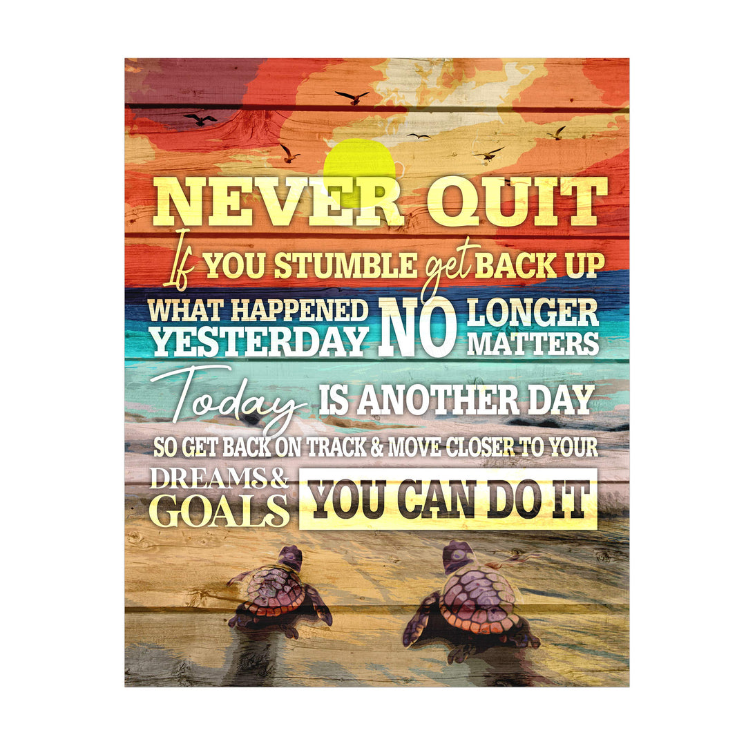 Never Quit-You Can Do It Inspirational Beach-Ocean Themed Sign-11x14" Motivational Wall Art Print w/Sea Turtle Image-Ready to Frame. Rustic Home-Beach House-Nautical Decor! Printed on Photo Paper.