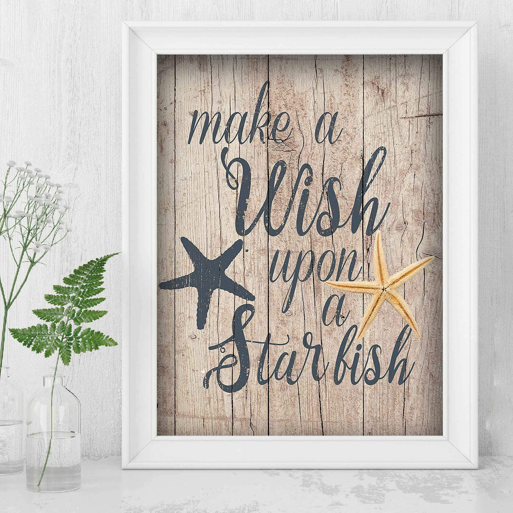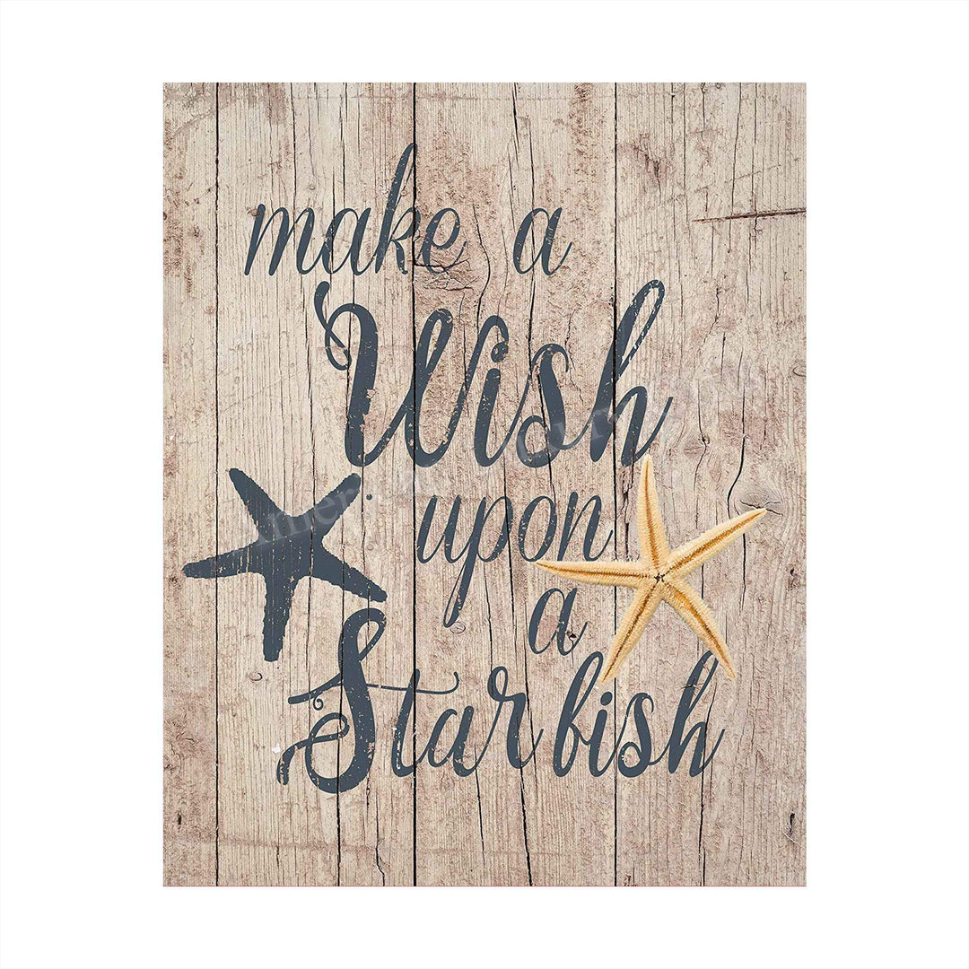 Make A Wish Upon A Starfish Inspirational Beach-Ocean Themed Sign -8 x 10" Wall Print w/Starfish Images-Ready to Frame. Replica Distressed Wood Design. Perfect Home-Beach House-Nautical Decor!