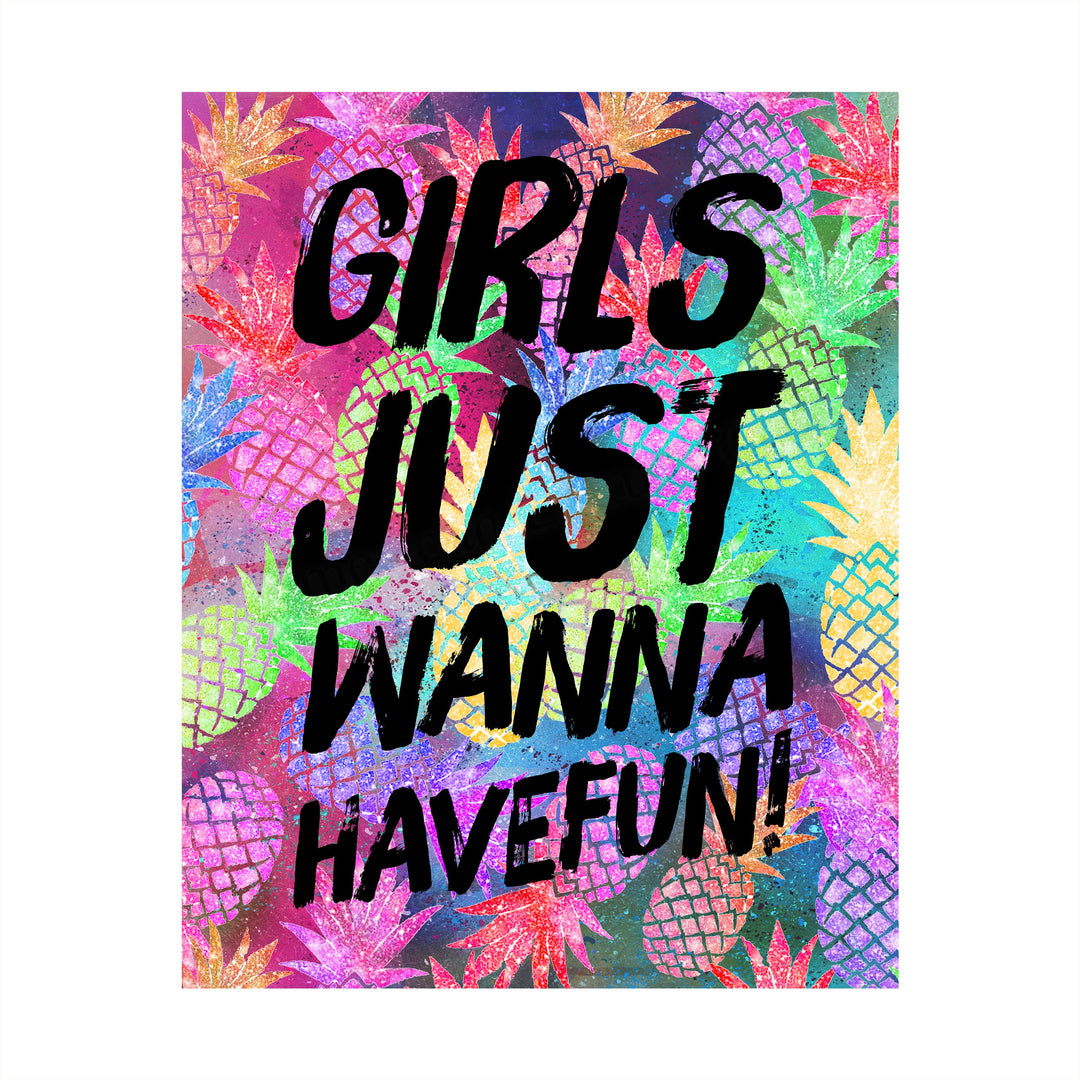 Girls Just Wanna Have Fun Funny Beach Sign -8 x 10" Neon Pineapple Wall Art Print-Ready to Frame. Fun Song Lyric Print for Home-Girls Bedroom-Beach House-Ocean Decor. Great Gift for All Girls!