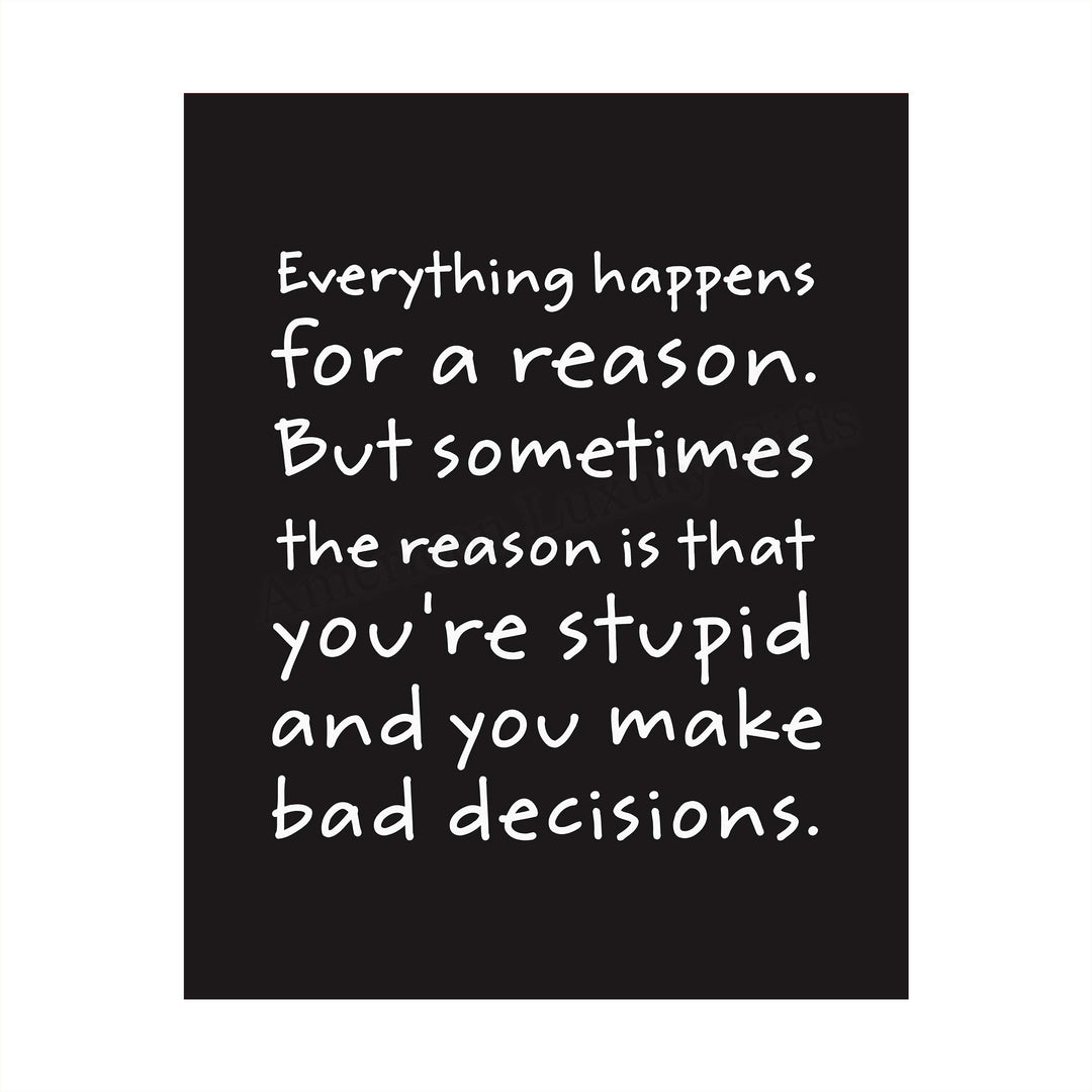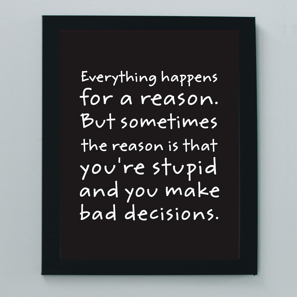 Everything Happens for a Reason-Make Bad Decisions Funny Wall Art Sign -8 x 10" Typographic Poster Print-Ready to Frame. Humorous Home-Bar-Shop-Cave-Novelty Decor. Great Gift for Sarcastic Friends!