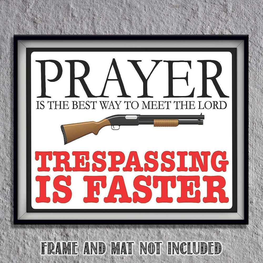 Prayer is Best Way To The Meet Lord- Trespassing is Faster- Funny Sign Print- 10 x 8" Wall Decor Poster Print- Ready To Frame. Great Gift & Perfect Door Sign for Man Cave-Garage-Bar-Home Decor.