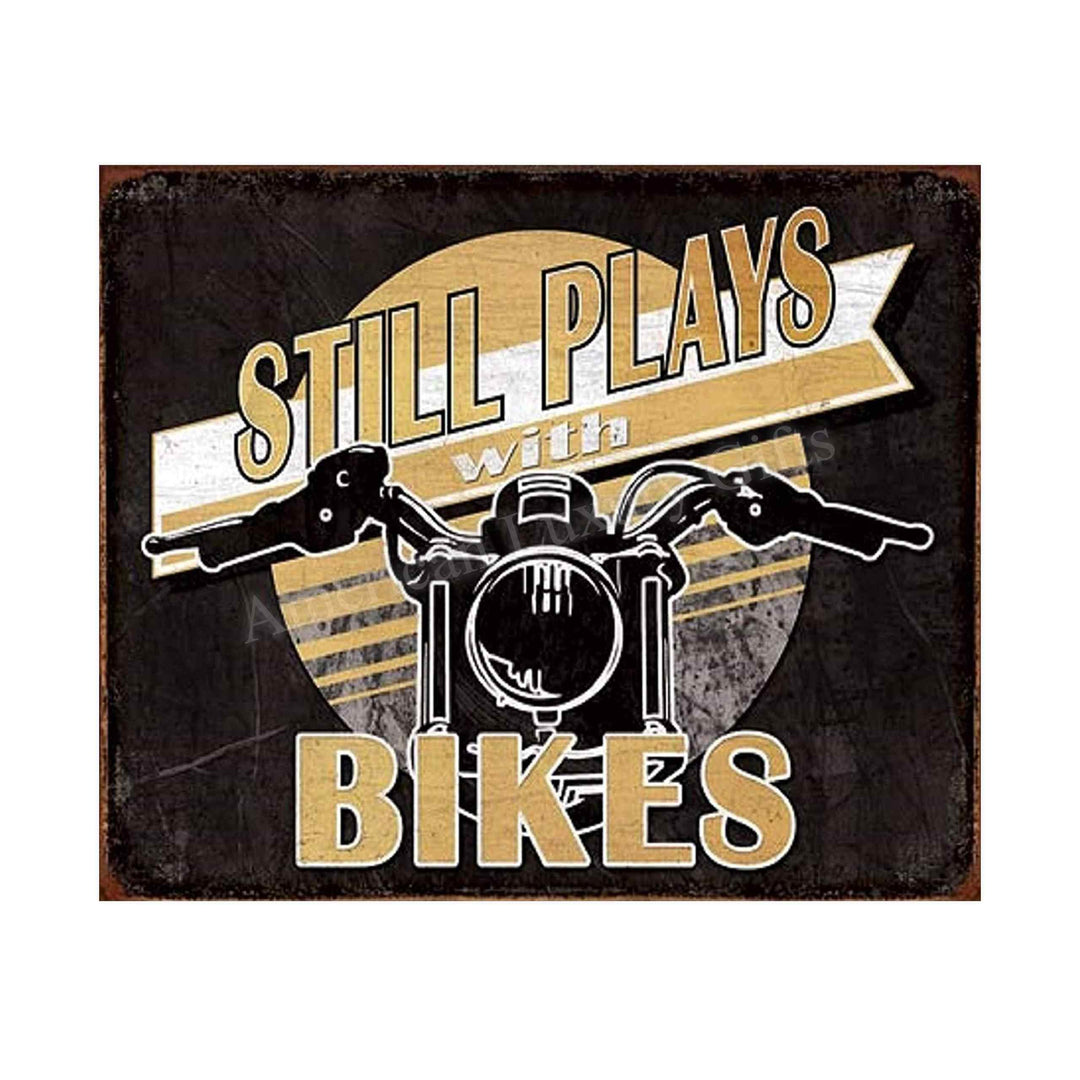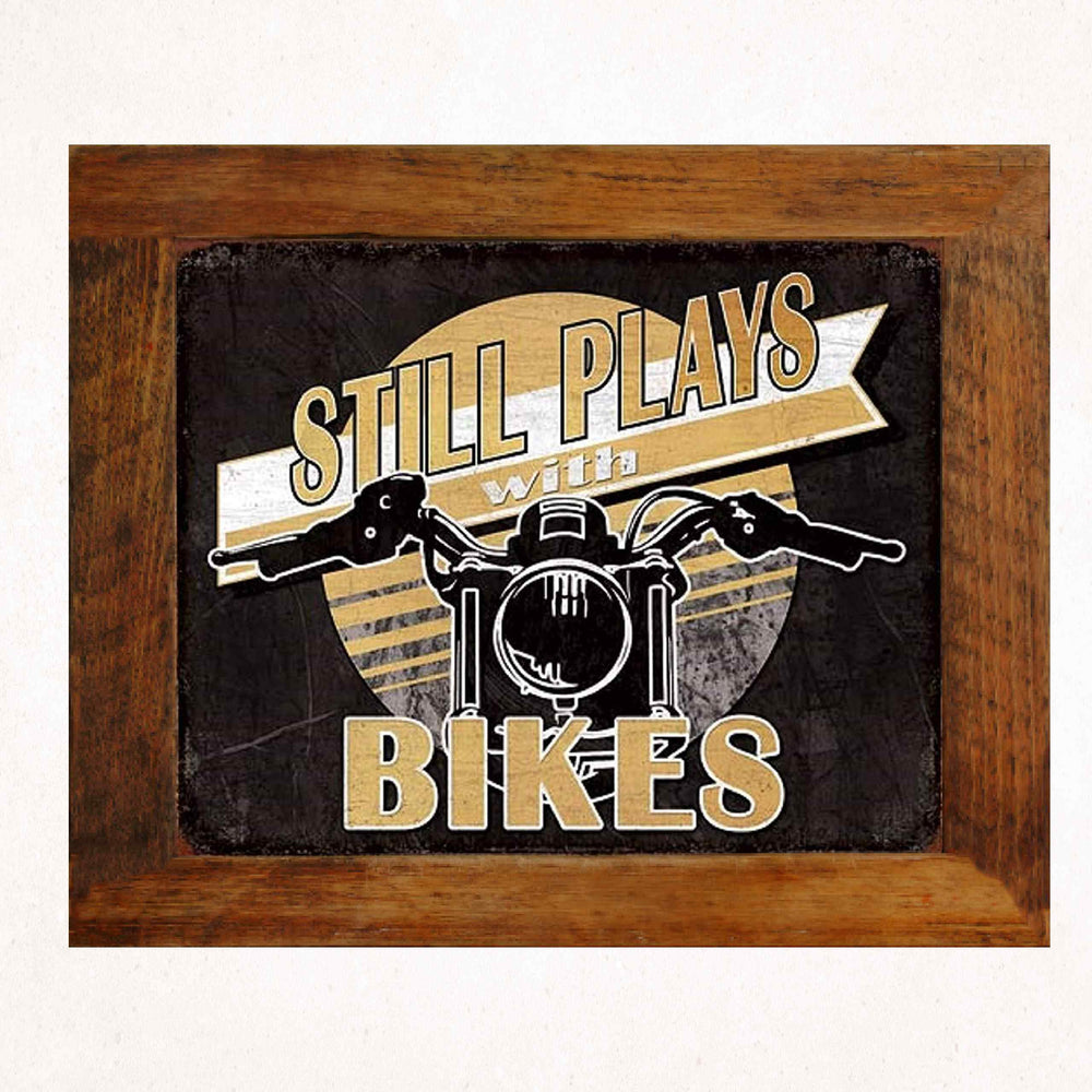Still Plays With Bikes- Funny Motorcyclist Sign Print. 10 x 8"- Biker Wall Decor-Ready To Frame. Humorous Distressed Decor for Home-Office-Man Cave-Bar-Garage. Great Gift-Motorcyclists & Gearheads!