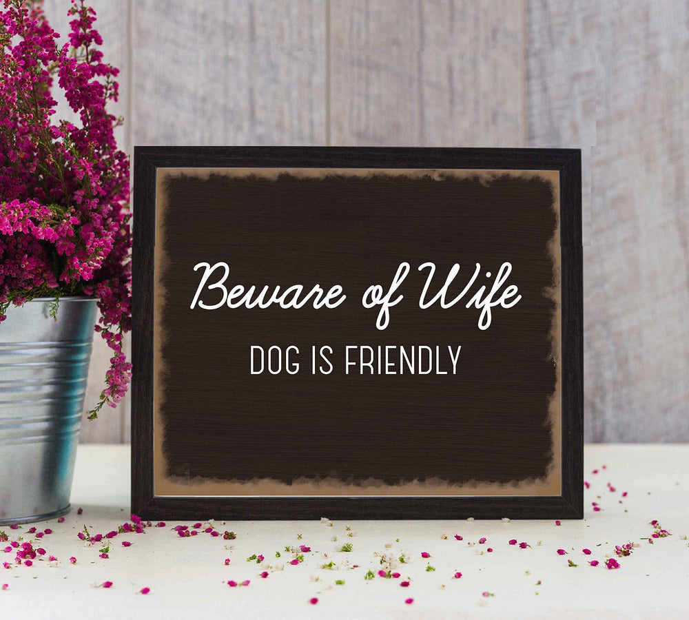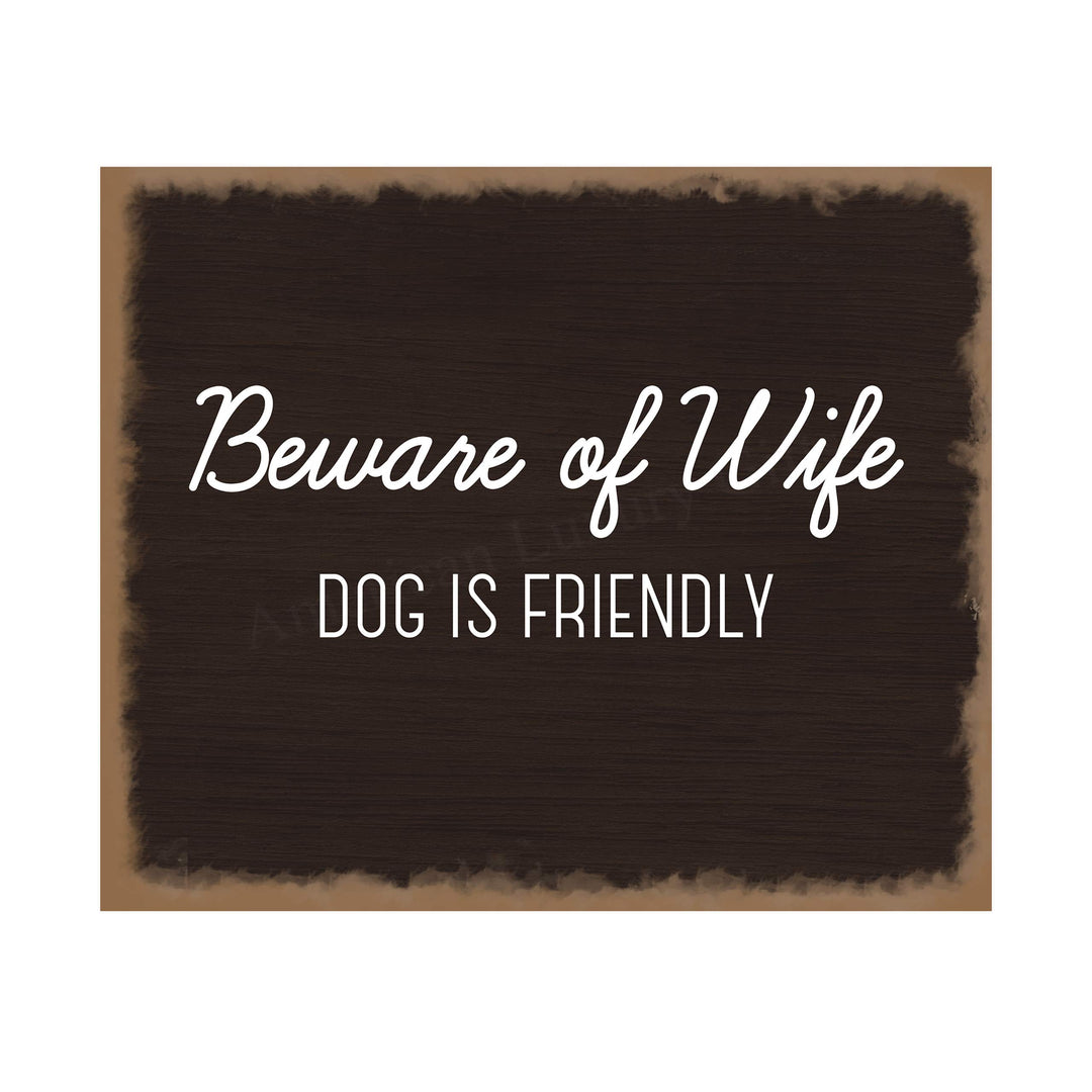Beware of Wife-Dog Is Friendly- Funny Sign Poster Print- 10 x 8" Wall Art Print-Ready to Frame. Humorous Decor for Home-Entry-Man Cave-Garage-Shop. Great Novelty Sign & Fun Gag Gift for Couples!
