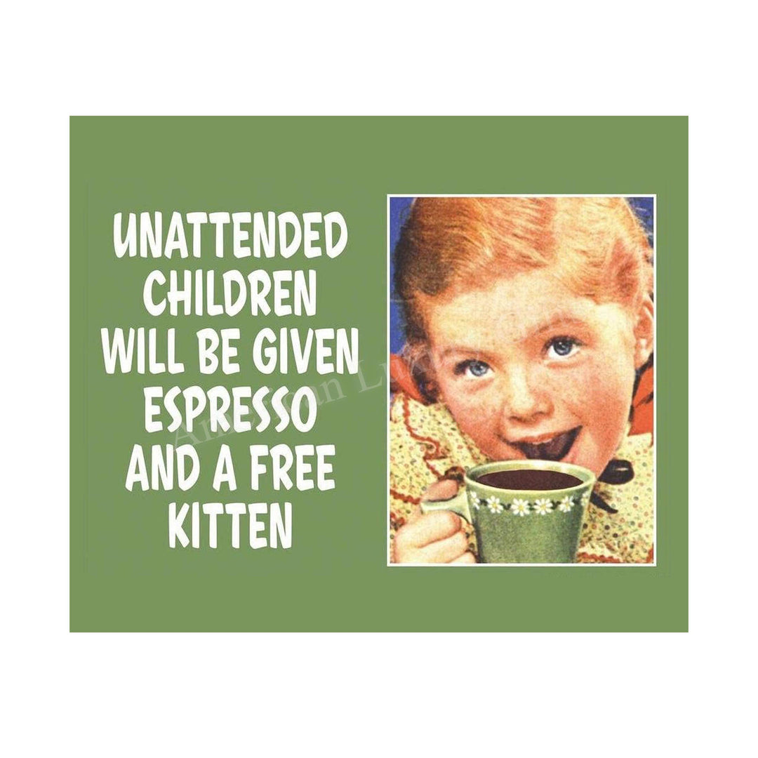 Unattended Children Given Espresso & Free Kitten Funny Welcome Sign -10 x 8" Humorous Wall Art Print-Ready to Frame. Perfect Home-Office-Studio-Man Cave-Garage Decor. Fun Reminder for Guests!
