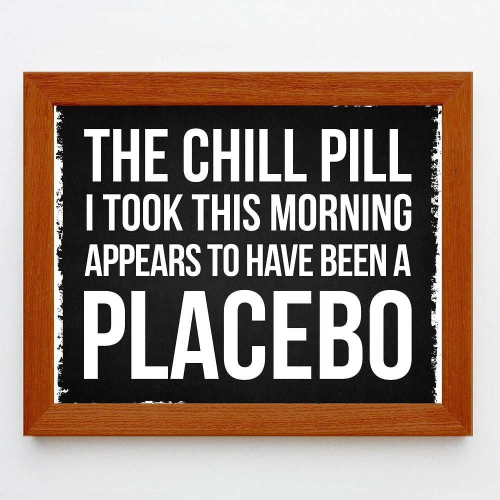 Chill Pill I Took This Morning a Placebo Funny Wall Sign -10 x 8" Sarcastic Art Print-Ready to Frame. Humorous Decor for Home-Office-Bar-Shop-Man Cave. Great Desk-Cubicle Sign. Fun Novelty Gift!
