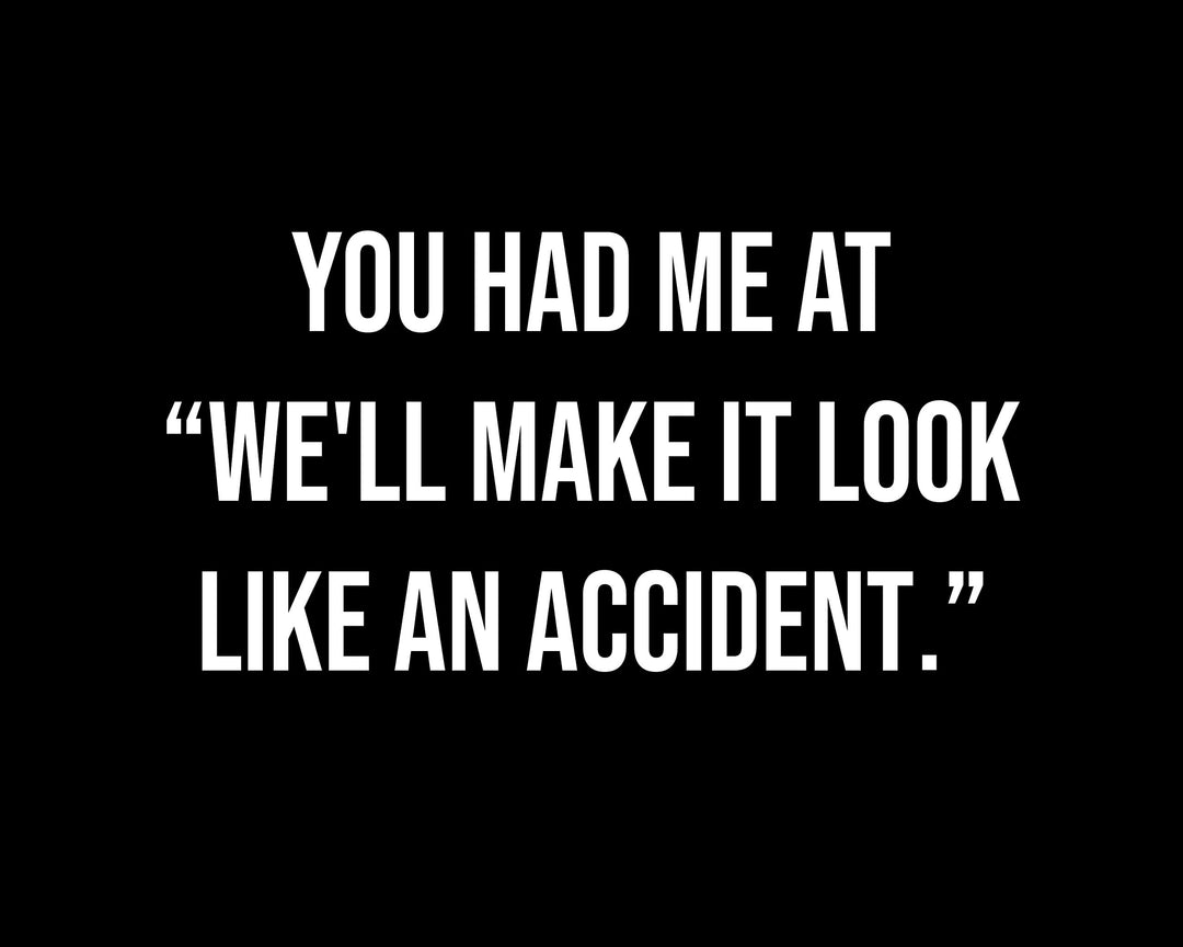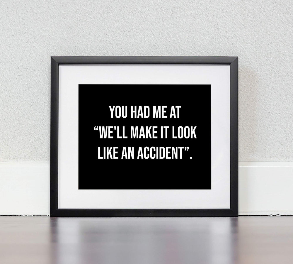 You Had Me At-"We'll Make It Look Like An Accident"- Funny Sign Poster Print- 10 x 8" Wall Decor Print-Ready To Frame. Humorous Decor for Home-Man Cave-Garage-Bar-Shop. Great Door Sign & Gag Gift.