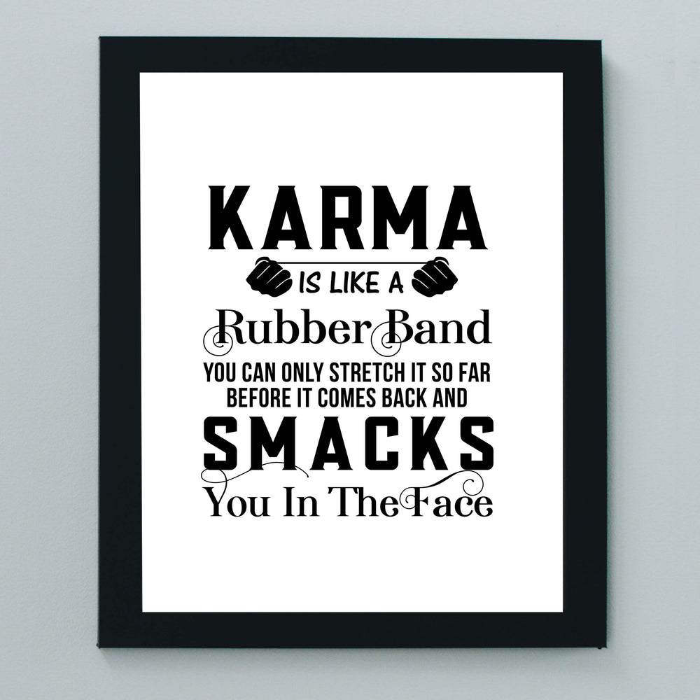 Karma Is Like A Rubber Band-Can Only Stretch So Far Funny Quotes Wall Art Sign -8 x 10" Sarcastic Poster Print-Ready to Frame. Humorous Home-Studio-Office-Desk Decor. Great Advice and Fun Gift!