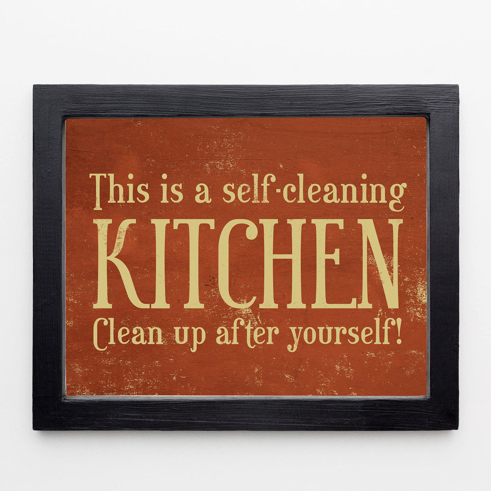 "This Is a Self-Cleaning Kitchen" Funny Rustic Wall Sign -10x8" Country Farmhouse Art Print w/Replica Wood Design-Ready to Frame. Humorous Home-Kitchen-Office Decor. Fun Gift! Printed on Photo Paper.